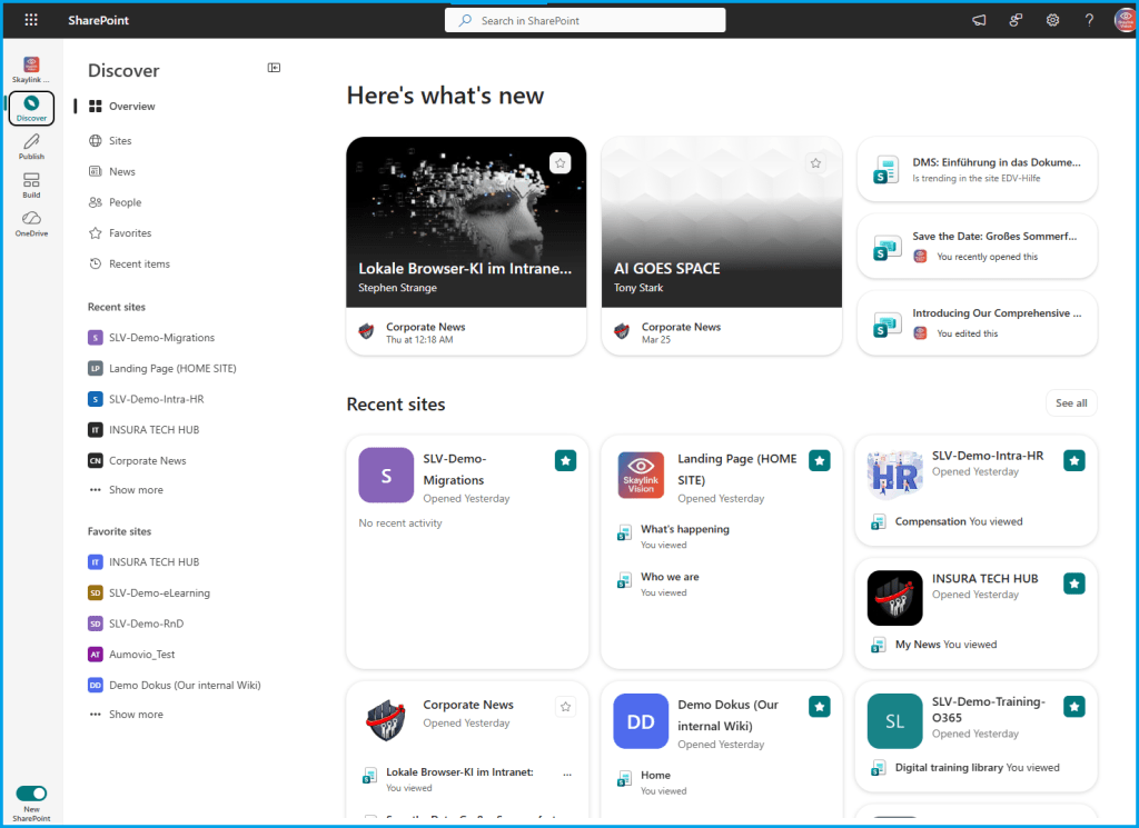 A reimagined entry point replaces the classic SharePoint start page. The Discover experience surfaces relevant sites, files, and news—prioritized by context and activity rather than static navigation structures.