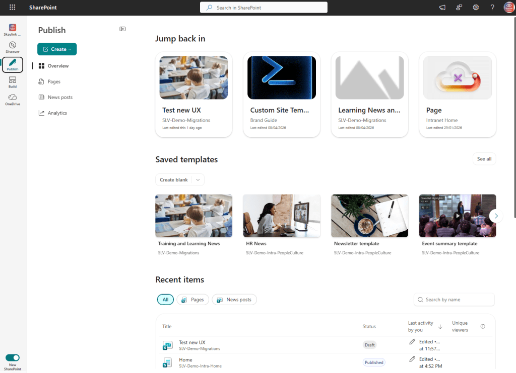 Publishing is no longer scattered across pages, news posts, and campaigns. The new Publish hub brings everything together into a unified content publishing experience, supporting structured communication at scale and aligning with Amplify‑powered campaigns.